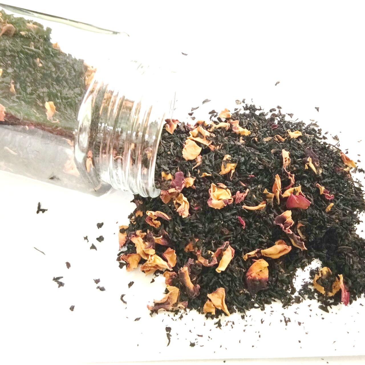 Darjeeling Black whole leaf tea flavored with 100% natural Rose flavor, and blended with Rose flowers |