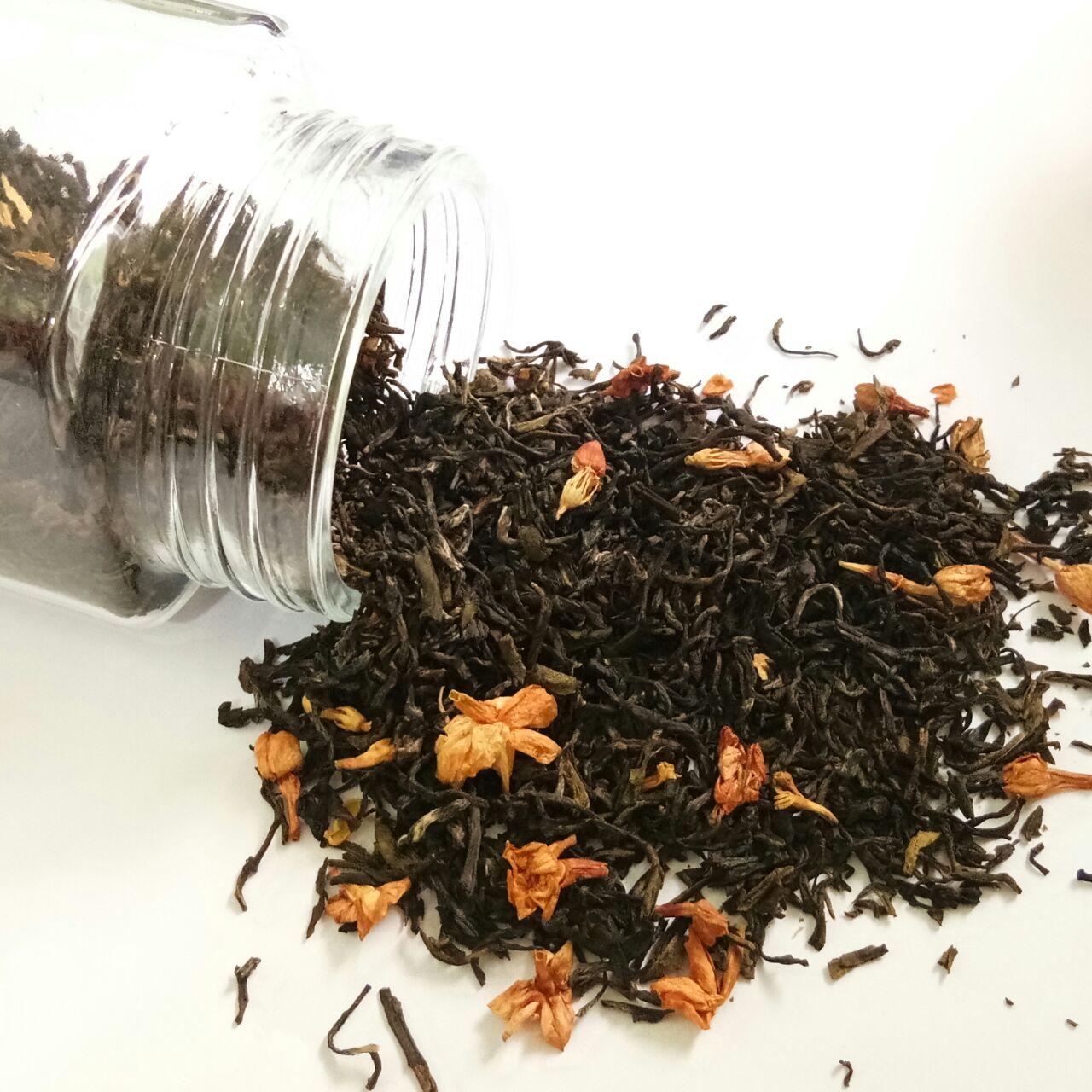 Darjeeling Black whole leaf tea flavored with 100% natural Orange flavor, and blended with mint |