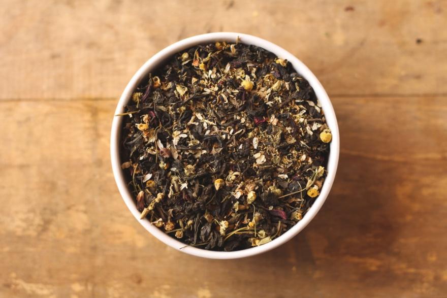Black tea and Herbal Infusion, bursting with flavor this beautiful tea combines Orange and Lemon Peel, Apple pieces, Hibiscus, Sunflower & Rose petals, Black currant flavor. |